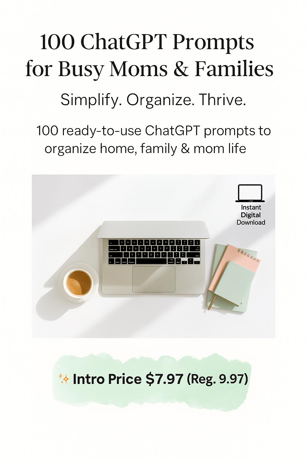This beautifully designed digital workbook includes 100 ChatGPT prompts created especially for busy moms who want to organize their homes, simplify routines, and make family life easier.